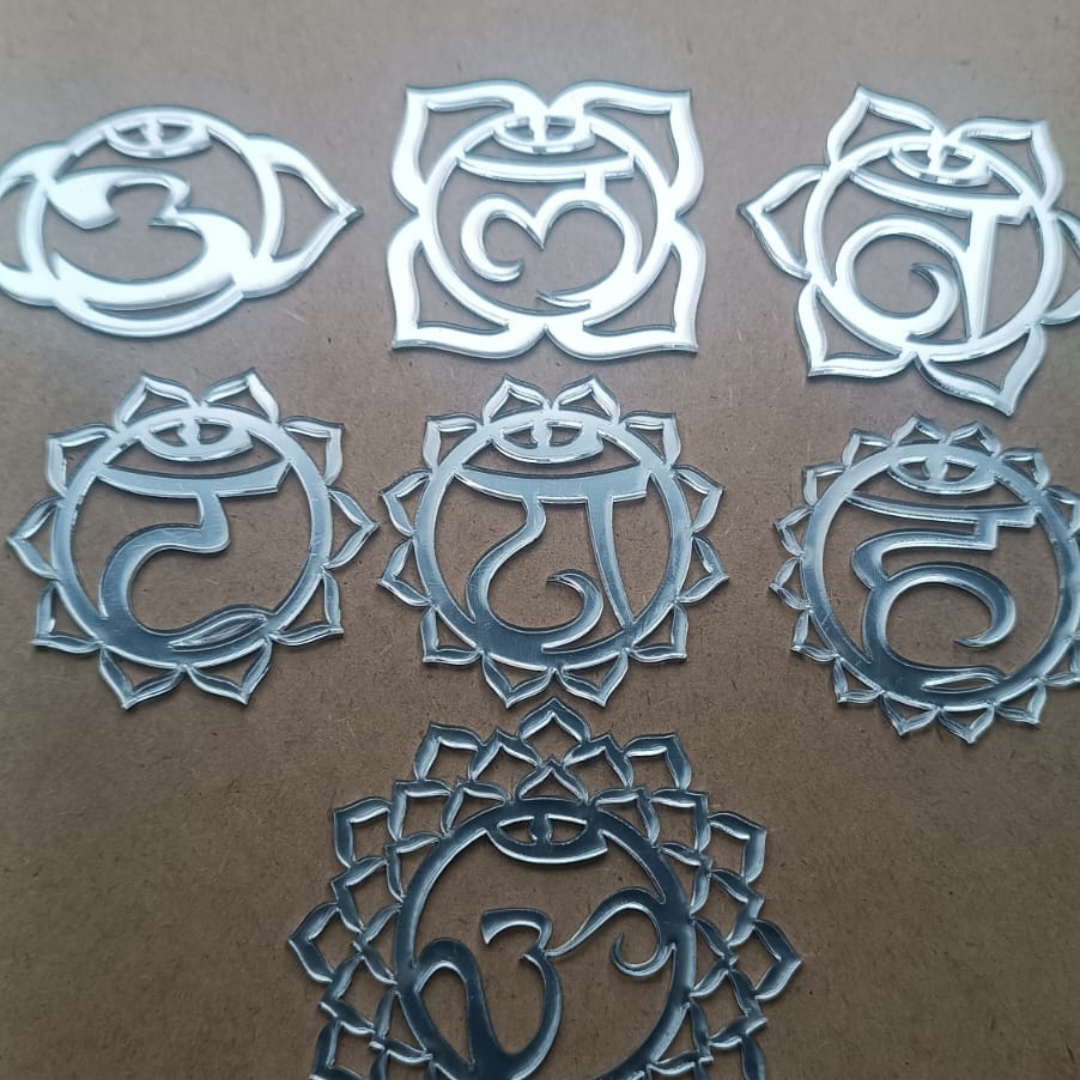Jogo com 7 peças em acrílico espelhado - símbolos dos CHAKRAS.