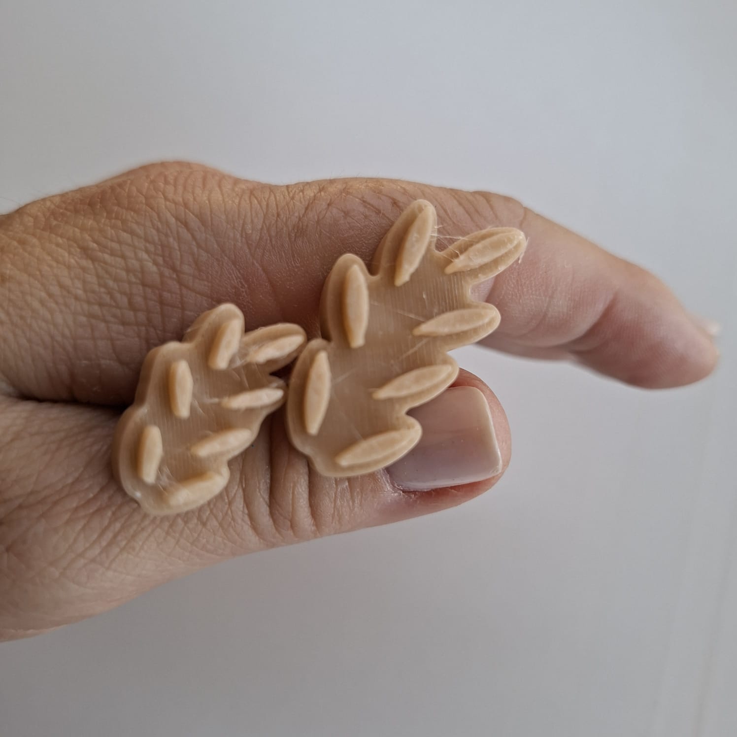 Cada carimbo possui duas pontas em tamanhos diferentes, sendo uma maior e outra menor, oferecendo mais versatilidade e permitindo criar composições com variação de escala e acabamento mais detalhado.